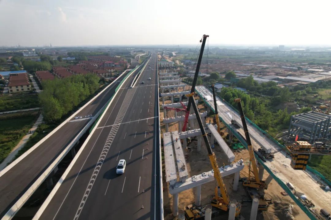 公鐵立交作為全線重點控制性工程,全長691米,緊鄰疏港高速匝道,與鐵路、村道、燃?xì)夤芫€多重交叉,大型設(shè)備移動受限。公司從工藝工法、質(zhì)量控制、安全交底等方面入手,組織專家論證,優(yōu)化吊裝路徑,采取大噸位吊車協(xié)同“抬吊”施工方式,確保工程順利推進。